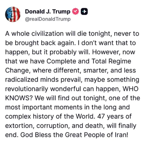 Notice how His Excremency pitches the “death of a civilization” as though it were just another shitty episode of reality TV: “We will find out tonight, one of the most important moments in the long and complex history of the World.” But first, this message from Mar-a-Lago-Mars!