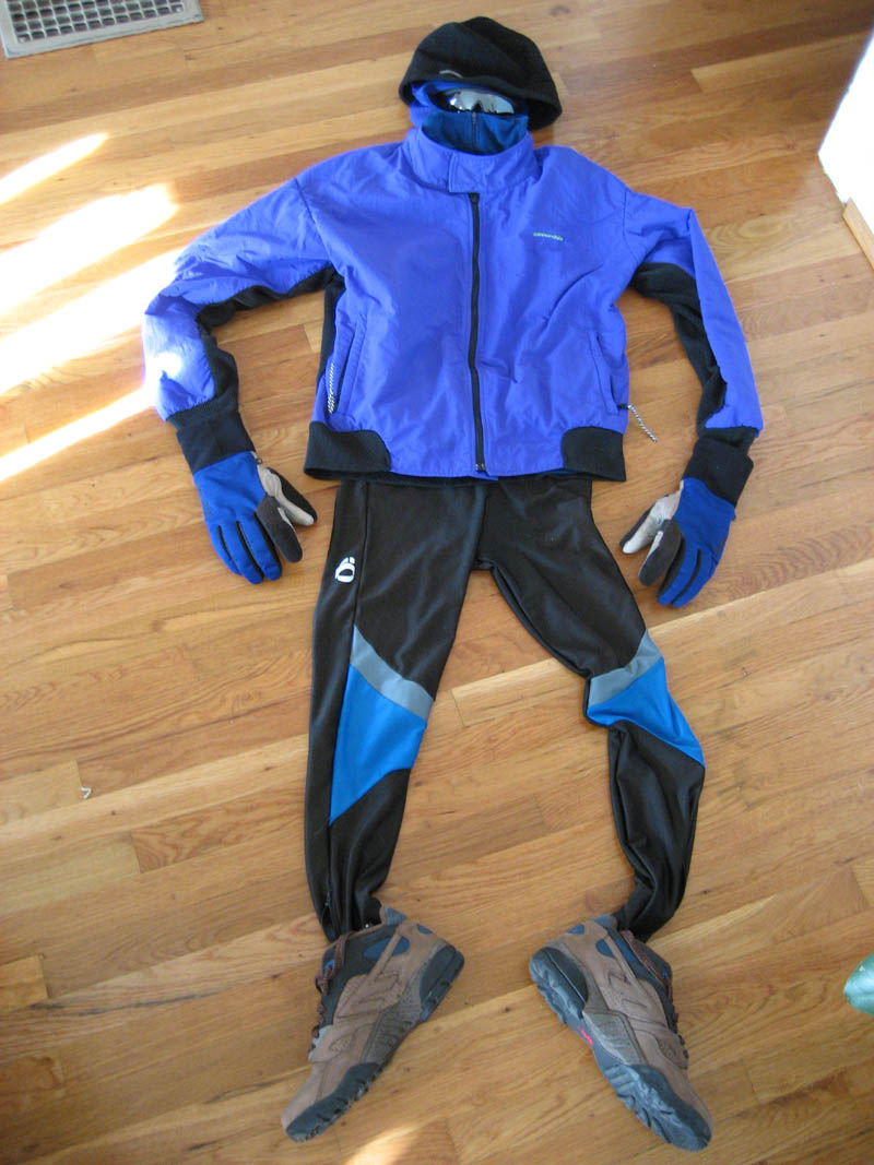 My winter kit is a motley collection of premillennial gear, most of it so old I can’t remember where or when I got it (though most of it was made in the USA, which is something of a tip-off). From top to bottom, today’s ensemble went like this: Columbia tuque; Patagonia ski mask; Smith glasses; Cannondale jacket; Patagonia turtleneck; Pearl Izumi gloves, bibs and heavy-duty tights; SmartWool socks; Hi-Tec GT Euro shoes. Only the gloves, glasses and shoes came from overseas. And I know for a fact that the socks are the only item purchased in this millennium, from Colorado Running Company.