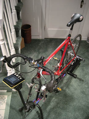 The stationary trainer: Cycling without all that annoying fun stuff. I unfolded the Cateye and attached a bike this afternoon after catching a glimpse of tomorrow’s forecast, which calls for a chance of snow, wind and a high of 19 degrees. Not exactly a day at the beach.