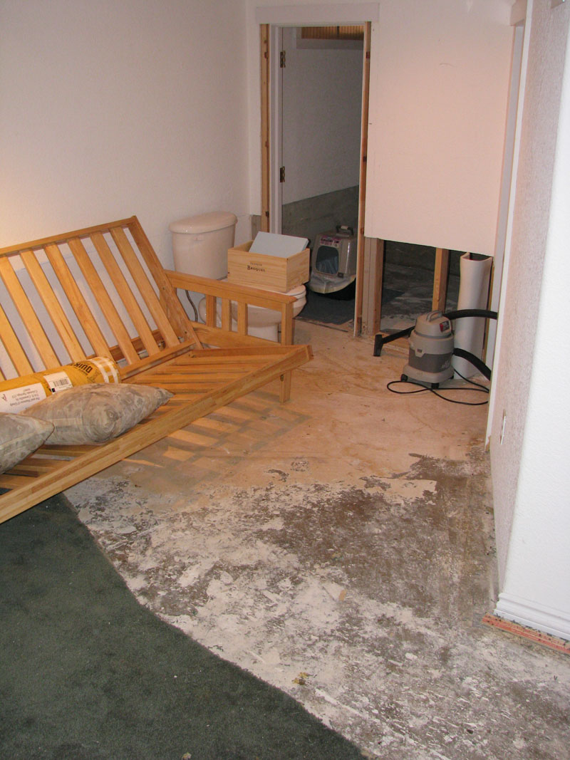 They say a picture is worth a thousand words. I can give you both. Here’s a shot of the basement a week after a sewer crew fountained Herself’s crapper, ruining carpet, vinyl flooring, drywall and my sunny disposition. The outfit hired to handle the cleanup and restoration is on the job, and God willing (and the toilet don’t rise) we should have a functional garden-level basement once again sometime by, oh, I dunno, the 2010 Tour de France. Maybe.