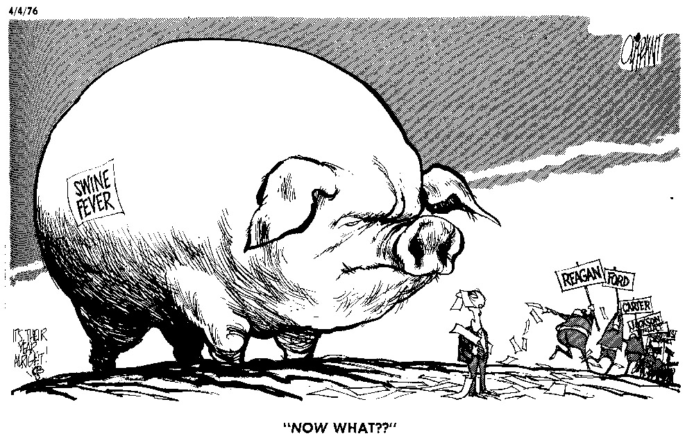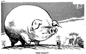 From our The More Things Change Etc. Department comes this cartoon by Pat Oliphant, circa 1976. This is not the first time the swine have sought revenge upon the long pigs for turning them into chops, bacon and green chile stew, and it won’t be the last.