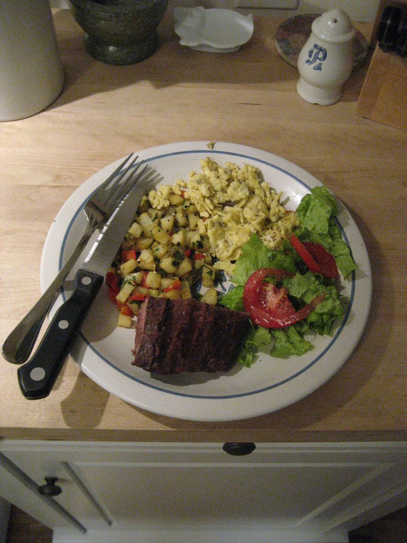 A light dinner last night called for a medium-heavy breakfast this morning. I’m talking eggs scrambled with chopped green chile and minced garlic, diced spuds with green chile, red bell pepper, scallions, garlic and cilantro, shredded lettuce and sliced tomatoes drizzled with olive oil, and a hunk of leftover grilled flatiron steak. Plus coffee, of course. A day without the velvety black goodness is a day without sunshine.