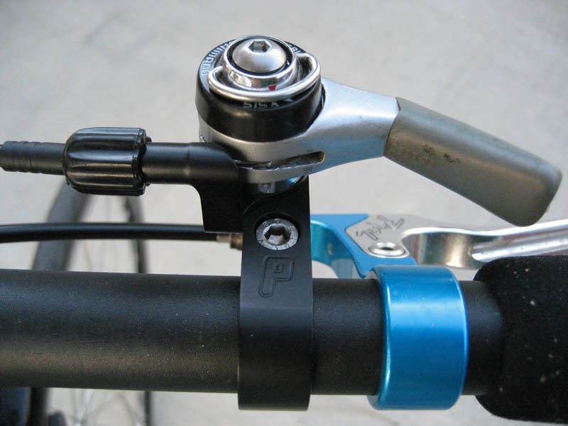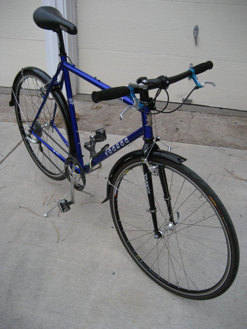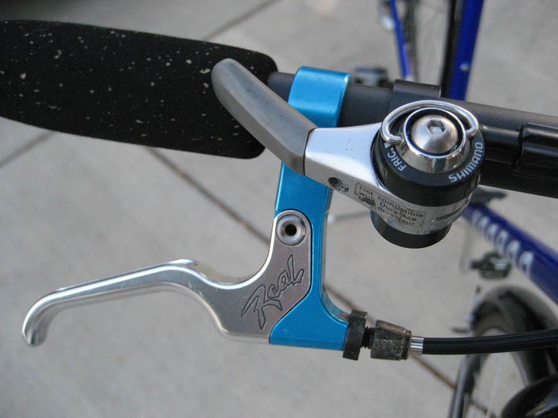Running a single-ring setup spares me the temptation of trying to shift into a gear I probably can’t push anyway. The smallish Real brake levers — salvaged from my mountain bike some years back when I finally surrendered to the inevitable and went to XT V-brakes — are easily operated with the index finger. Plus their light blue nicely complements the darker blue of the frame and my splinted finger. The cork grips give the injured hand a little more cushion than handlebar tape. And finally, a half set of Paul’s Thumbies let me turn that seven-speed bar-end shifter into a bar-top thumb-shifter so I can keep my right hand on the bar at all times. Pretty cool, eh?