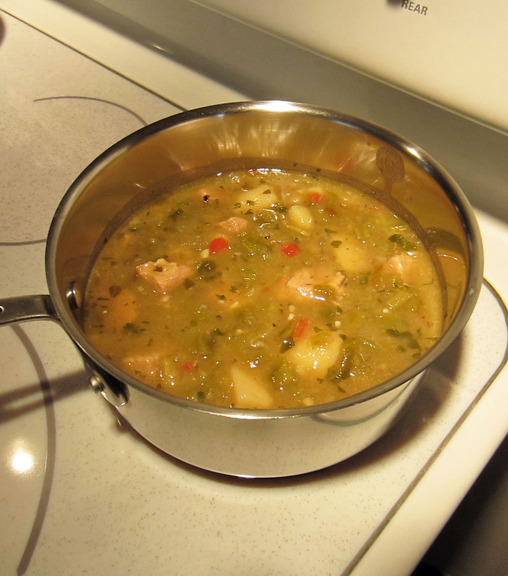 I bought four bags of the green goodness — two medium, two mild — and got busy in the kitchen last night. There were plenty of leftovers, so you can imagine what we had for lunch on this cool, breezy Sunday.
