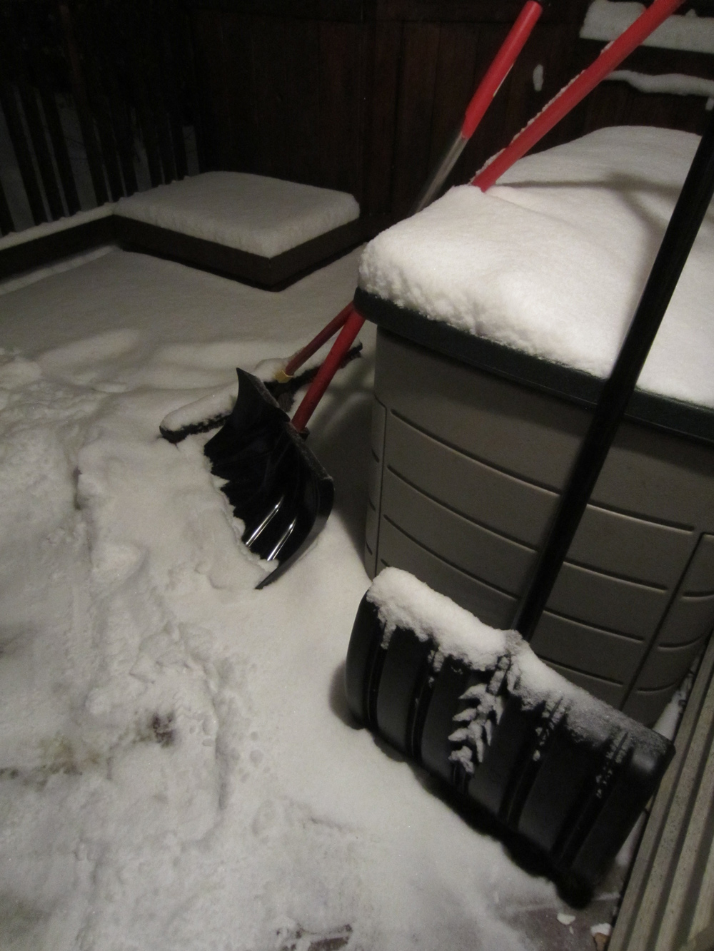 We got a nice little snowfall today. I moved some of it around this morning and should’ve moved some more this afternoon. What the hell, it will still be there tomorrow, and it will have company. Good for the lawn, what there is of it, and good for the trees. Good for me, too, as we have no gym membership and pushing the mouse around hardly qualifies as strength conditioning.