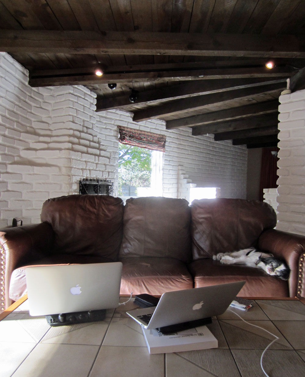 I’m out of practice at working on the go, and it shows. I tapped away at the MacBook in a crouch from the couch until I remembered the previous owner had left a cheapo desk and chair in a back room. Duh. That took a few of the kinks out of my process.