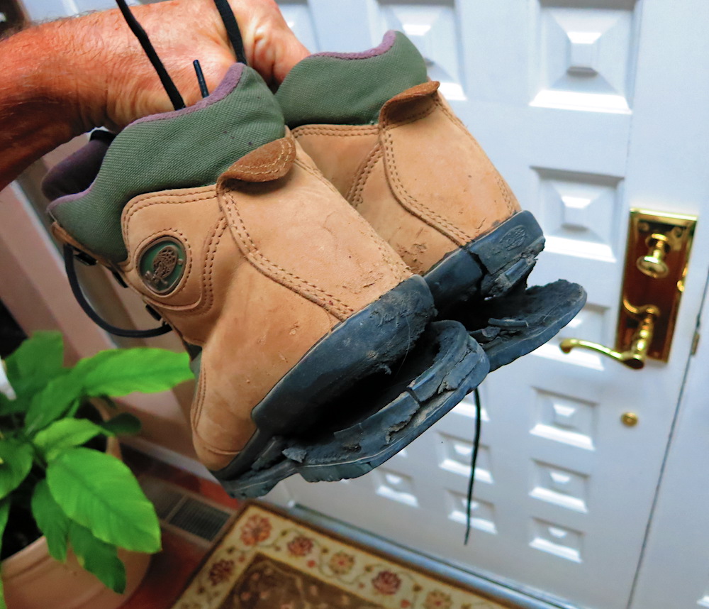 Wise choice, as it turns out. On the way home my decrepit hiking boots performed what Herself, a former outdoor-equipment retailer, called “a de-lam’.” Both soles basically crumbled and peeled away at the heels.