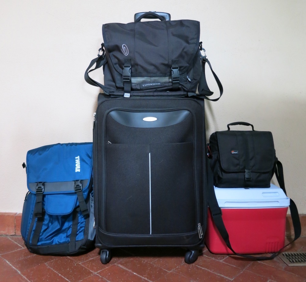 Look at the pile of luggage I dragged into the Luxor for Interbike last month. I could’ve had a crazed midget with a sawed-off shotgun inside that rolling suitcase, a MAC-10 and a couple dozen extra magazines in the messenger bag, a few bricks of C4 in the backpack, a couple of Glocks with spare mags’ in the camera bag, and the boiled head of Sean Spicer in the cooler.