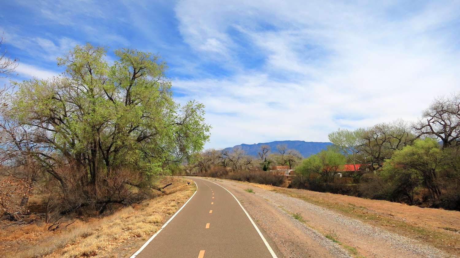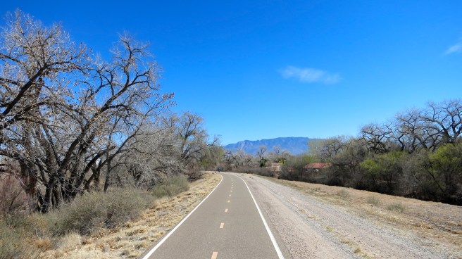 The weather being slightly insane — 63 degrees at the start, 73 at the finish — I rode down to pick up the bosque trail just west of downtown, took that to the Alameda parking lot, and then noodled over via 4th and Roy to the Tramway climb, which always seems to take about a half hour, no matter what bike I’m riding.