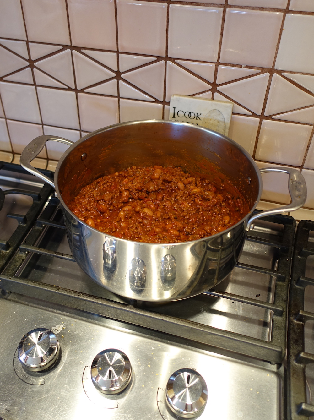 So as a sort of substitute and/or magic potion I’m making her famous chili from a stained, tattered recipe card the old gal typed up herself. It was one of the rare occasions when I asked her for something other than money to buy drugs.