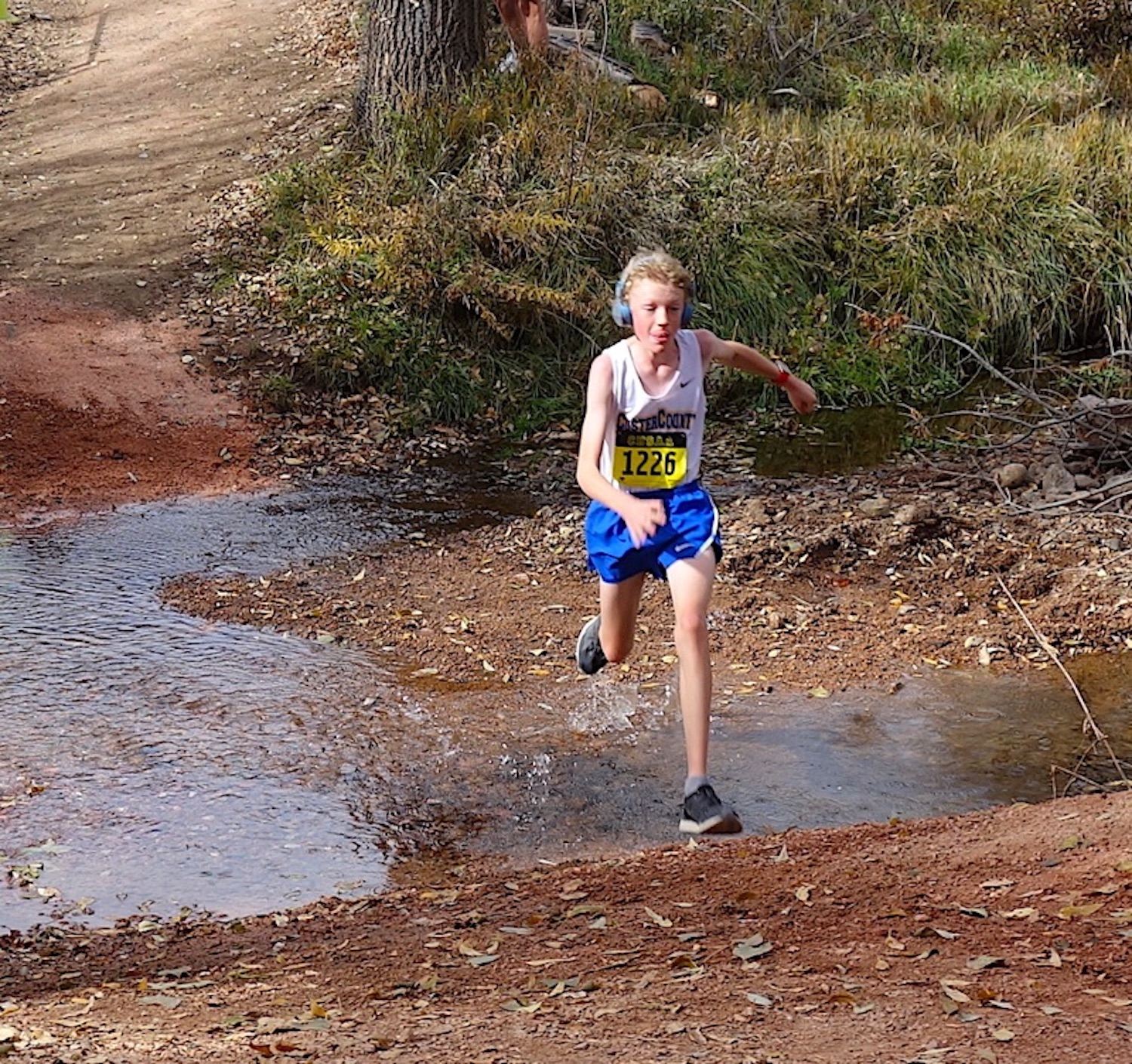 Harrison “The Blur” Walter hits the creek crossing at the 2018 Colorado cross-country championships. | Photo: Hal Walter