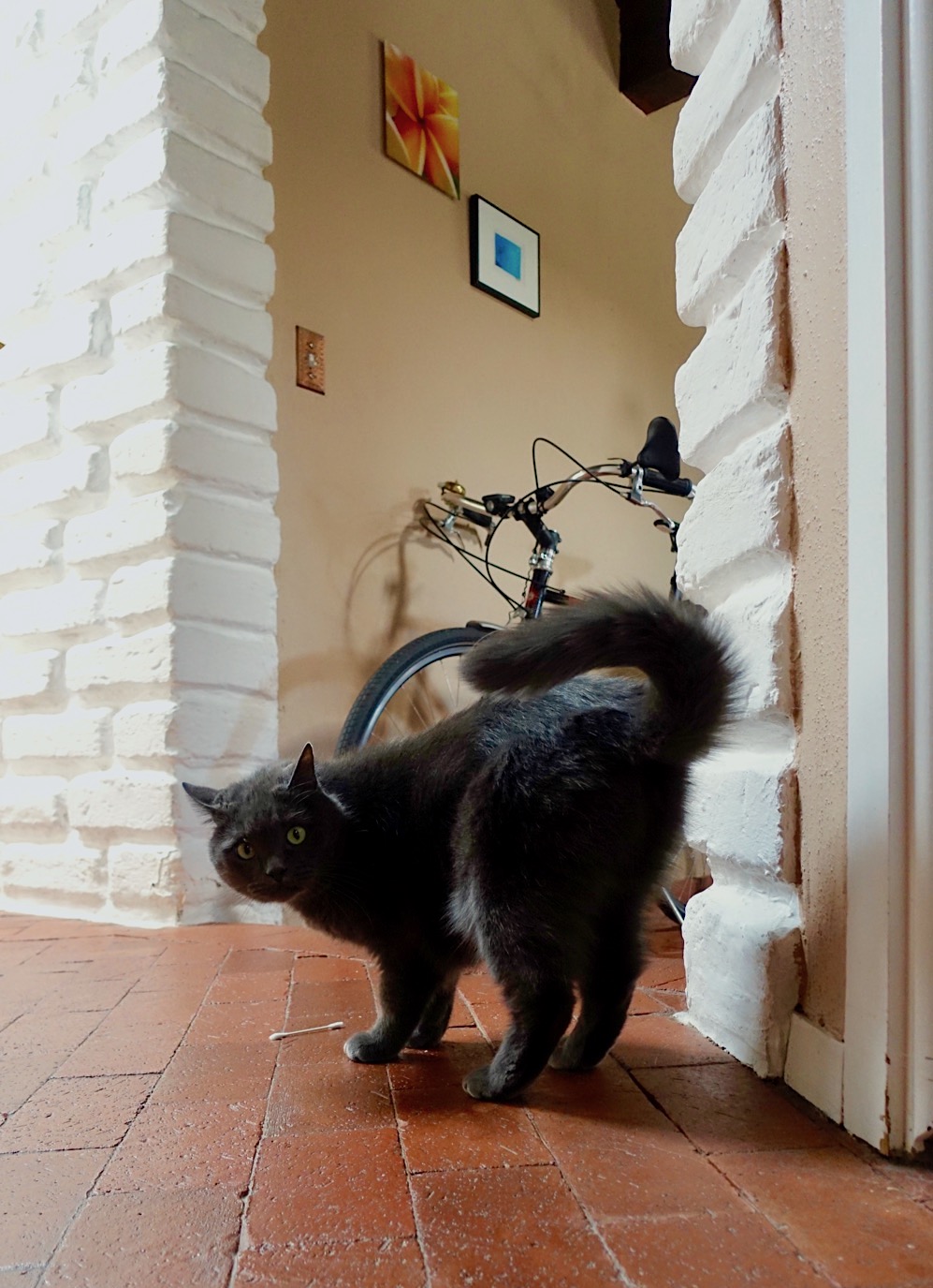 1. Genius. The elusive Miss Mia “whatcha looking at” Sopaipilla makes an appearance with her low tech toy! I was reading Tufts University newsletter, “Catnip” a few days ago and found out that I’ve been using the laser pointer all wrong. That is, I am supposed to offer an actual toy prey after a session. The cats need to actually ‘catch’ a toy and pummel it. Without this step pets become anxious and stressed. Unintended consequences. It makes sense when the argument is laid out.