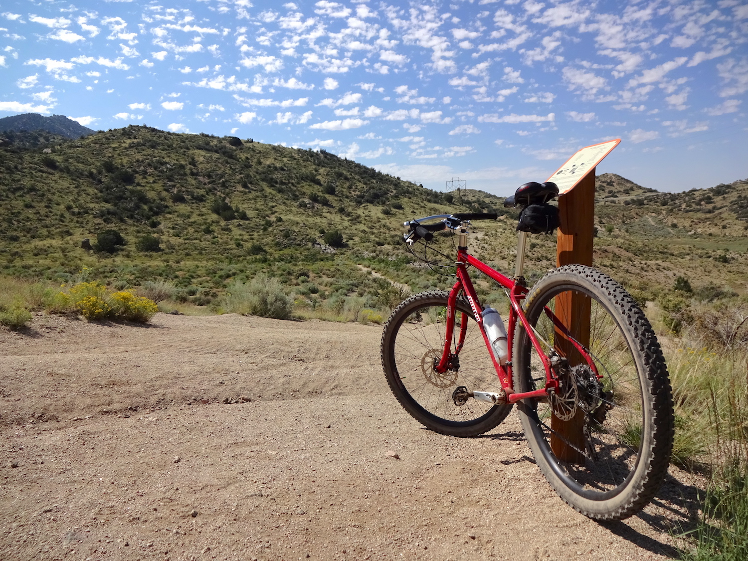 As I will never be smart, I pulled the Jones down from its hook and went kyoodling around the Elena Gallegos trails under the blazing sun. But there were plenty of other dummies impeding forward progress there, so I headed south for a quick inspection tour of Trails 365 and 365A.