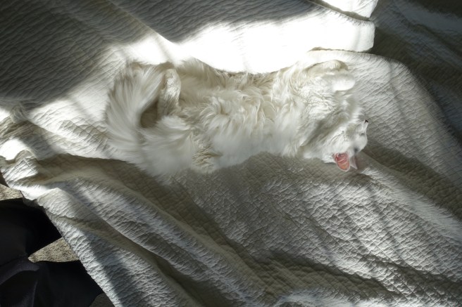 Exhausted by a long morning spent waiting for breakfast, Field Marshal Turkish von Turkenstein (commander, 1st Feline Home Defense Regiment) commandeers a sunny spot for purposes of R&R.