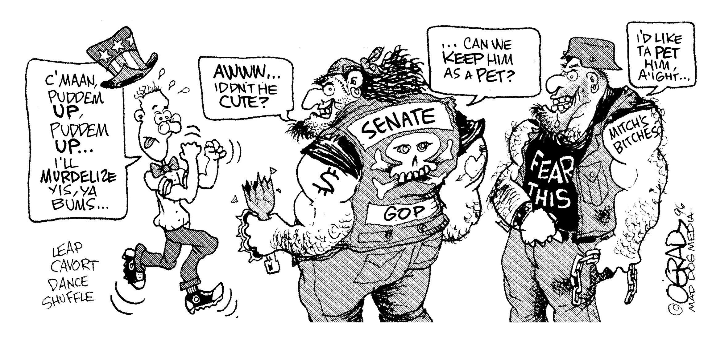 They couldn’t do shit in the House except make a lot of bad noise, like a poorly tuned Harley. That’s the junior chapter over there, a bunch of prospects on mopeds, hoping to wear the colors some day. Good luck with that. The Senate wouldn’t let a bag of farts like Louie Gohmert in the back door to swab out the toilets after Taco Tuesday if he promised to use his tongue.