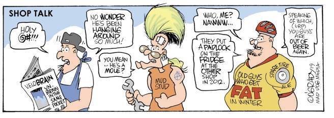 I finally sat up and slipped off the back because VeloNews seemed to be careening into the sort of future in which plague-carrying aliens burst out of people’s chests while they’re battling killer robots. The Old Guy Who Gets Fat in Winter went with me, to do the occasional walk-on in Bicycle Retailer’s “Shop Talk” comic strip.