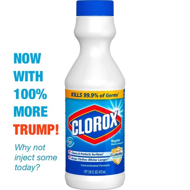 Sure thing, Dr. Demento. Let’s all mainline some Clorox, with tactical flashlights up our keisters. You go first.