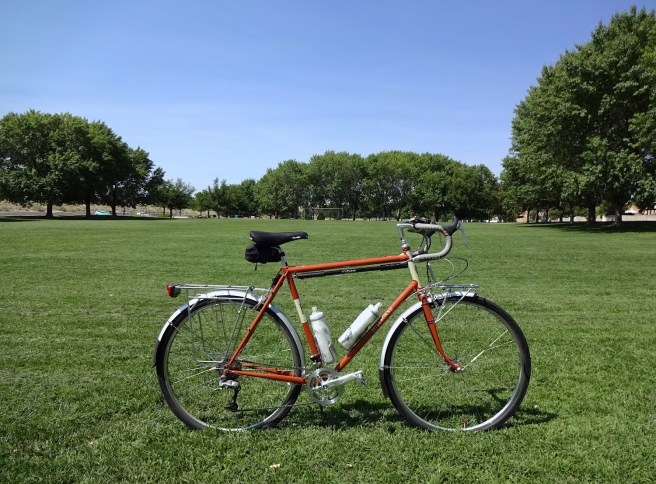 The Rivendell Sam Hillborne with its 45/35/24T triple, 11-32 cassette, and long-reach, dual-pivot brakes.