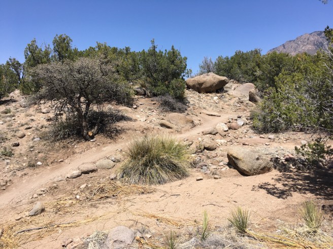 One I usually rode as a short descent. It was a real tooth-rattler, rocky and rutted, and I always took a good look around at the top because I didn’t want to meet anyone coming up when I was halfway down. It dumped into a sand pit and turned into a short, rocky climb with poor line of sight, so I usually hit the bell a time or two on the out of the pit.
