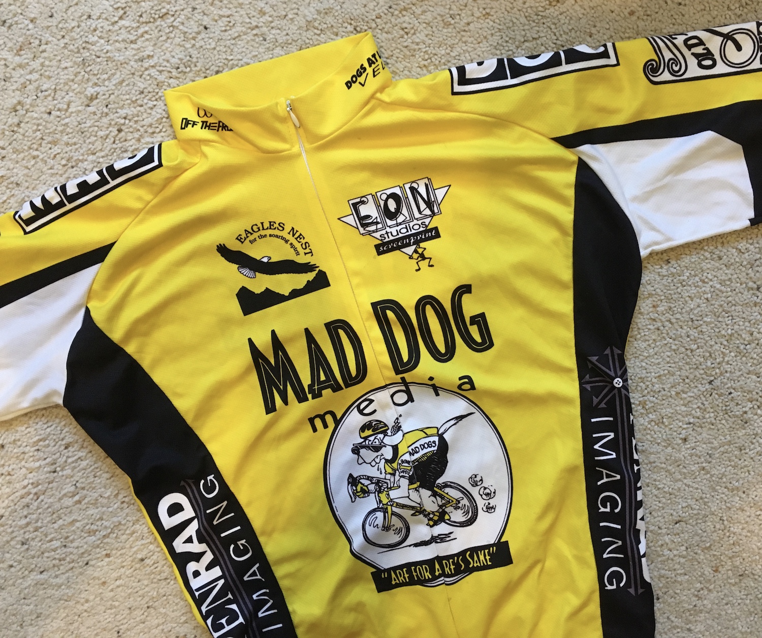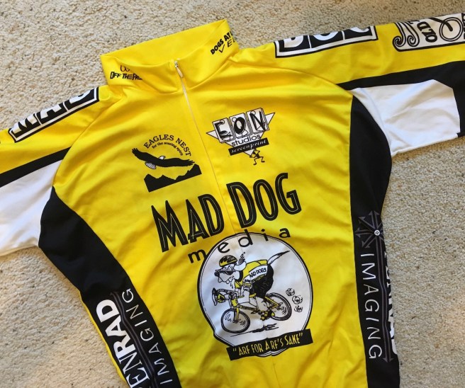 Specifically, the new Team Mad Dog Media/Dogs at Large Velo jersey from VOmax Team Apparel. It just happens to be yellow. Bright yellow. A vitamin-C-megadose, kidney-stone, construction-vehicle kind of yellow, festooned with black and white graphics. Perfect camouflage for ambushing Californians from a meadow bright with dandelions.
