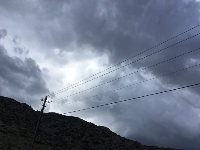 “Huh,” sez I, casting an appraising glance at the clouds glowering down at me from atop the Sandias. “Think I’ll mow the lawn.”