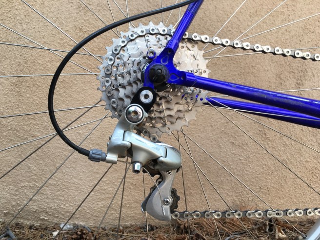 Now, the wiseguys have been using items like this for a good long while to retrofit wide-range cassettes to older bikes. The boyos at Wolf Tooth make a couple of them, the RoadLink and and GoatLink. Being an indifferent mechanic, I went with Riv’s bargain SunRace model to mitigate my shame should I achieve failure, as is often the case. Bought a nice KMC X8 chain while I was there, and then noodled on over to Soma Fabrications for a 7-speed S-Ride cassette (11-34T).