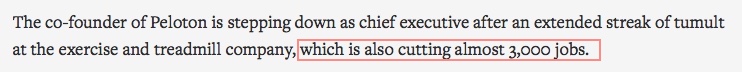• Editor’s note: I first saw this Peloton story at NPR, and then went straight to AP to see if the original was this fucked up (it was). Buried the lede. (Who gives a shit about a hapless CEO lateraled over to a cushy gig elsewhere?) Confused “there” for “their” and “its” for “it’s.” It took two people to write this dreck and at least two more to put it online. When the nuts and bolts are this bad, one fears for the solidity of the “content.”