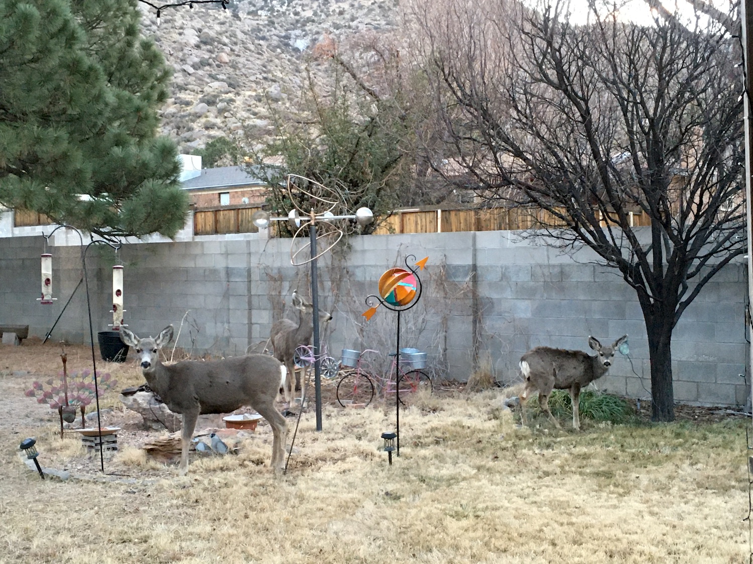 With aridification at a level not seen since mule deer and Native A’s had the run of the ranch around here, plus a mountain lion said to be working the Elena Gallegos Open Space, it’s no surprise a deer or two or three decides to take five here in the Compound, munch a bit of lawn with a side of birdseed.