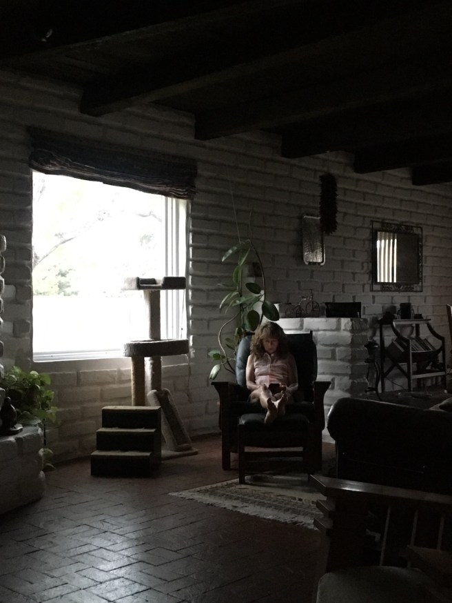 Skeeters drove Herself indoors to sit in the dark and play with her iPhone.