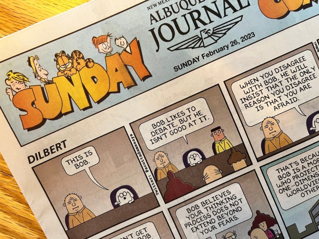 Until cartoonist Scott Adams took his header I hadn’t read “Dilbert” in years, but I remembered the strip being funny, even though I hadn’t had any real personal contact with office culture since I quit The New Mexican in 1991.