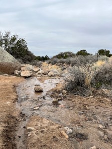 The water feature remains in operation, as you see. I hurdled it cyclocross style and went along my merry way. Here’s hoping that pleasant little rivulet helps dilute the shitshow downstream from Jemez Springs, where spring flooding has overwhelmed the sewage-treatment plant.