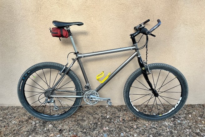 Don’t tell The Industry, but you can still mine a few giggles from a made-in-USA titanium MTB with a Tange steel fork, triple crank, eight-speed XT, V-brakes, flat bar, Grip Shift twisties, 26-inch wheels with 2.0 rubber, and a creaky old 1954 MeatSack® motor that couldn’t pass an emissions check in Mexico City no matter how much mordida you paid.