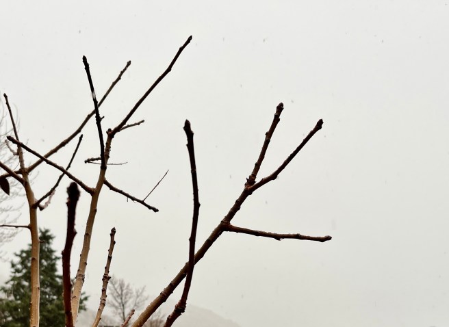 Overnight the rain swept in, nearly a quarter inch of it, followed by the fabled “wintry mix” and then actual snow this very dark morning. Sort of a heavenly apology to the trees for pulling their bloomers down, I suppose.