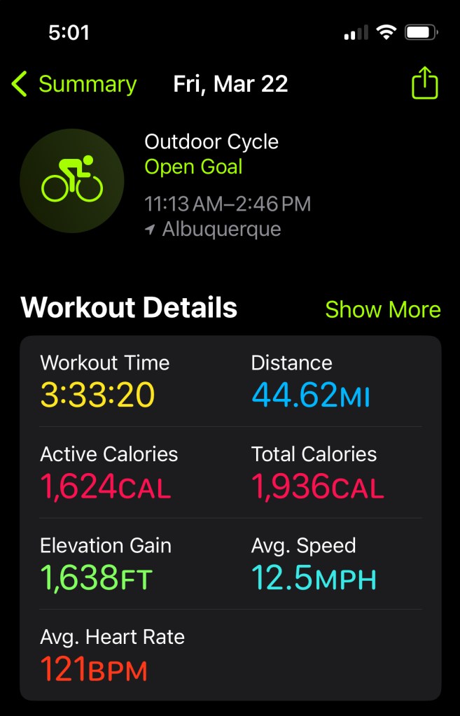 The final tally was 44.6 miles, or 71.8 kilometers; I only needed 43.5 miles to make 70km, but I figure the additional mile and change constituted a punishment tax for being a wuss and riding my age in kilometers instead of miles.