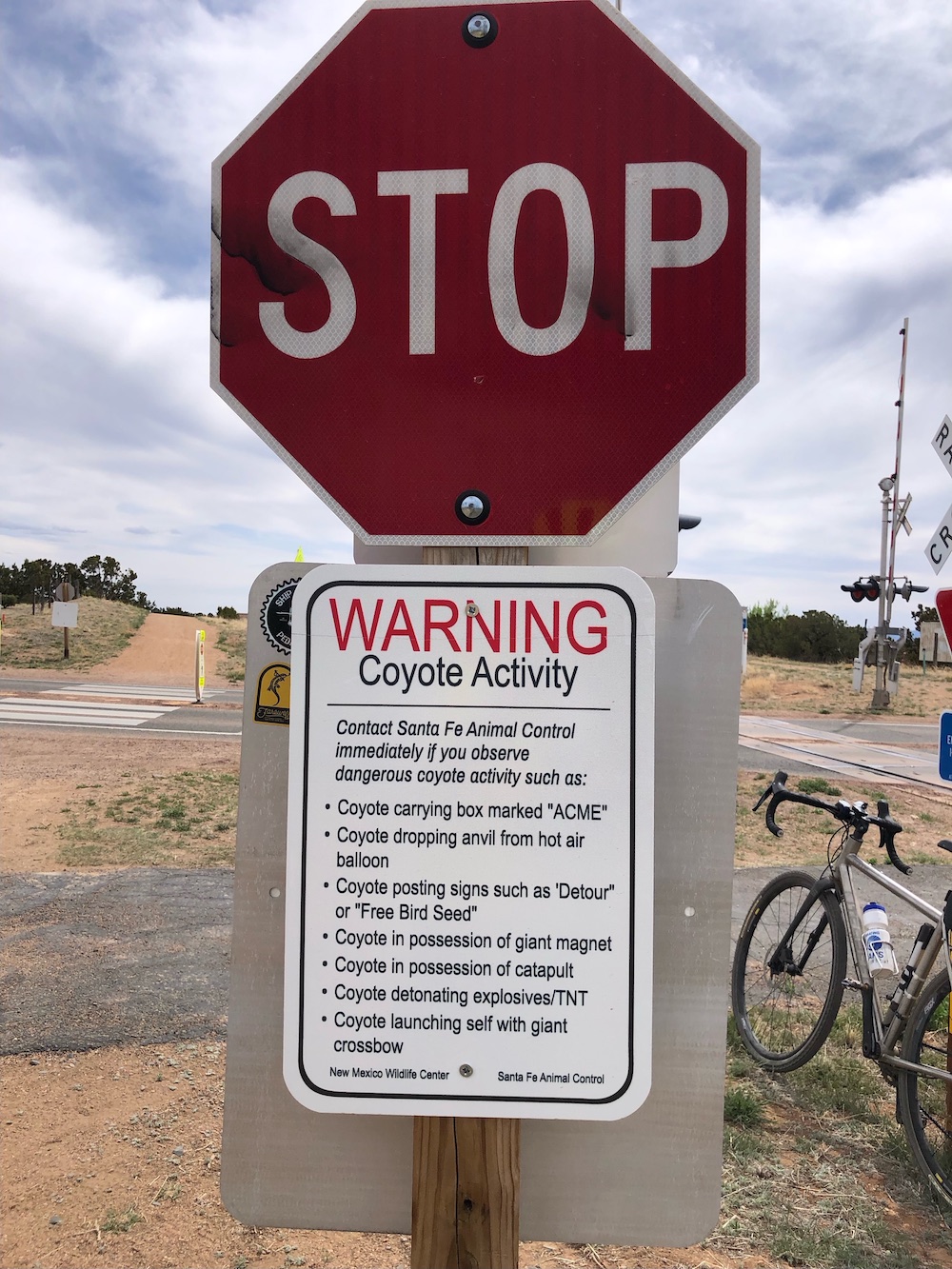 A tip of the Mad Dog’s ACME sun helmet goes out to Khal S. for finding this bit of signage along the Rail Trail in Fanta Fe.