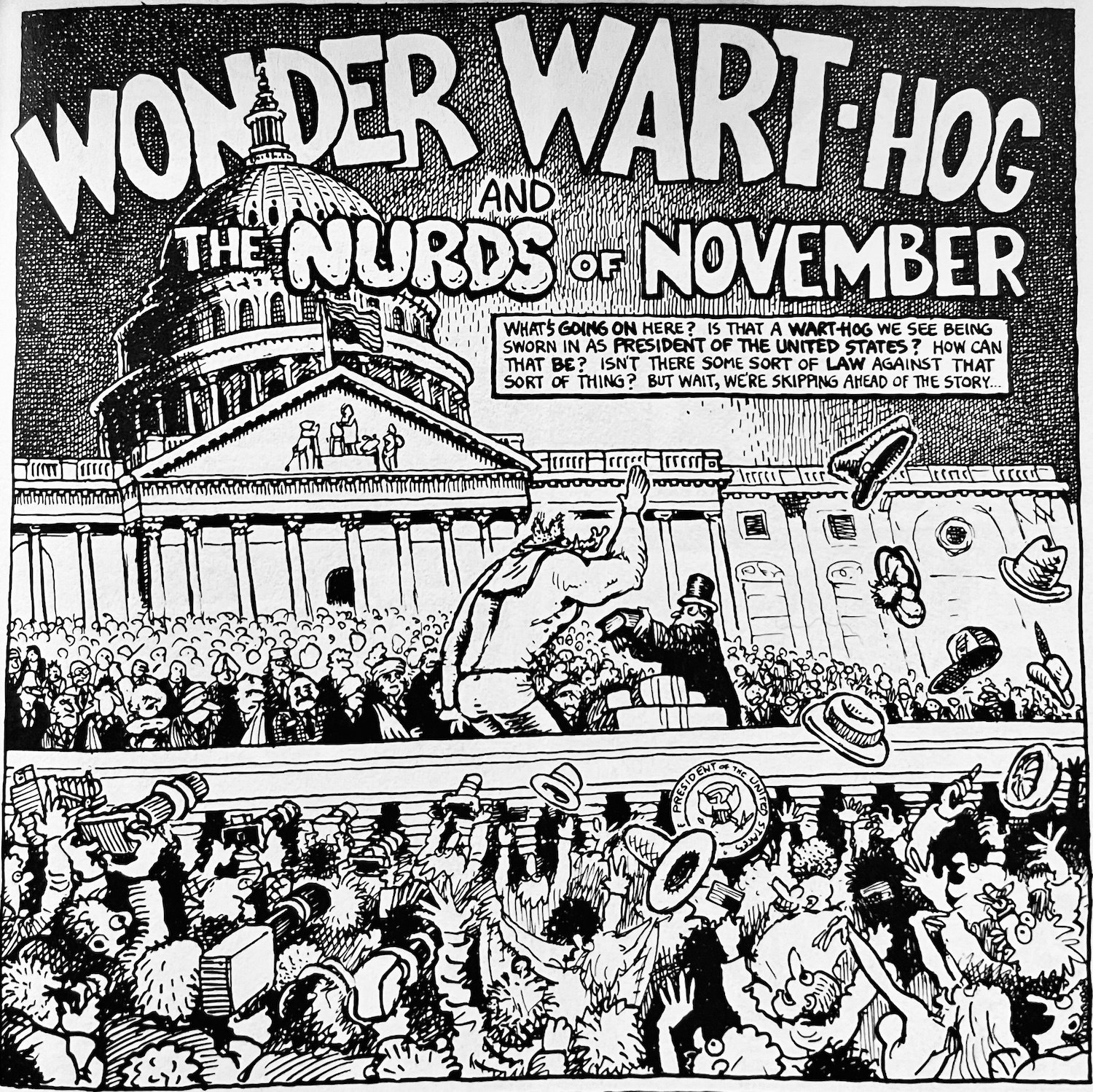 But man, he really hit his stride with “Wonder Wart-Hog and the Nurds of November.” A cartoon collection bearing that title was published in 1980, and the titular strip included the following: