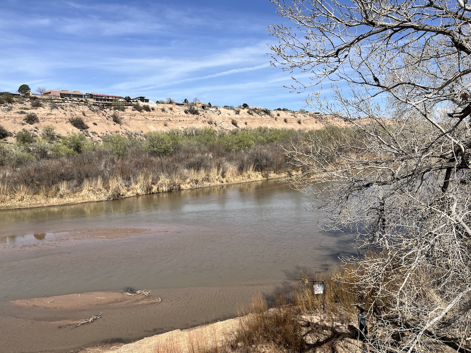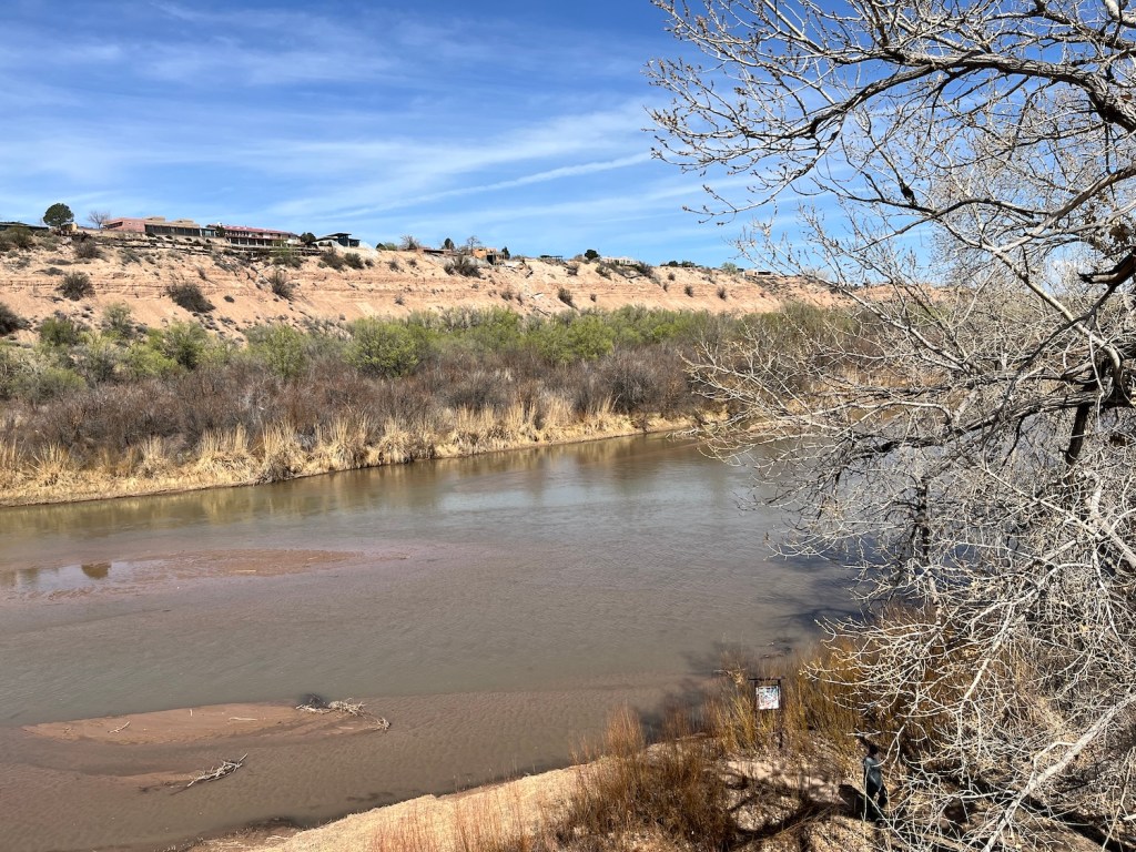 There was a slight headwind as I rolled south on the lightly greened Paseo del Bosque trail to I-40, where I hung a right to snap a shot of the Rio Grande from the Gail Ryba bike bridge. More like the Rio Not-So-Grande. Too thick to drink, too thin for swimming.
