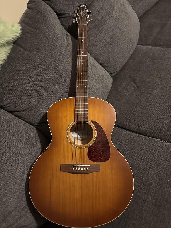 The Seagull was the first guitar I bought, Hoss. Got ’er used from Guitar Center here, before the outfit filed for bankruptcy. And yes indeedy, it has a larger, mellower tone than the Roadhouse. But it’s a little harder for me to play.