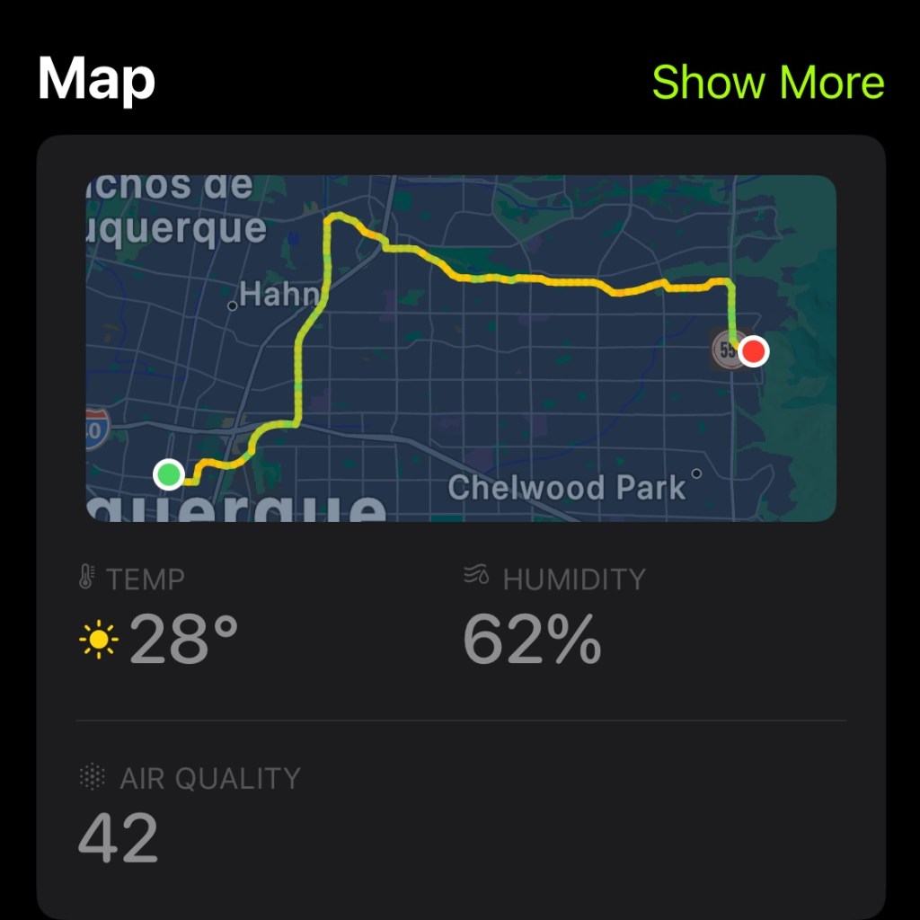 By the Arroyo del Oso Golf Course, with six miles to go, I had gained some altitude, caught a soupçon of sun, and warmed up just a bit … so much so that I began contemplating some extra-credit stupidity, to wit, leaving the pavement at Juan Tabo for the trails that wind through Bear Canyon Open Space to the Embudito trailhead.