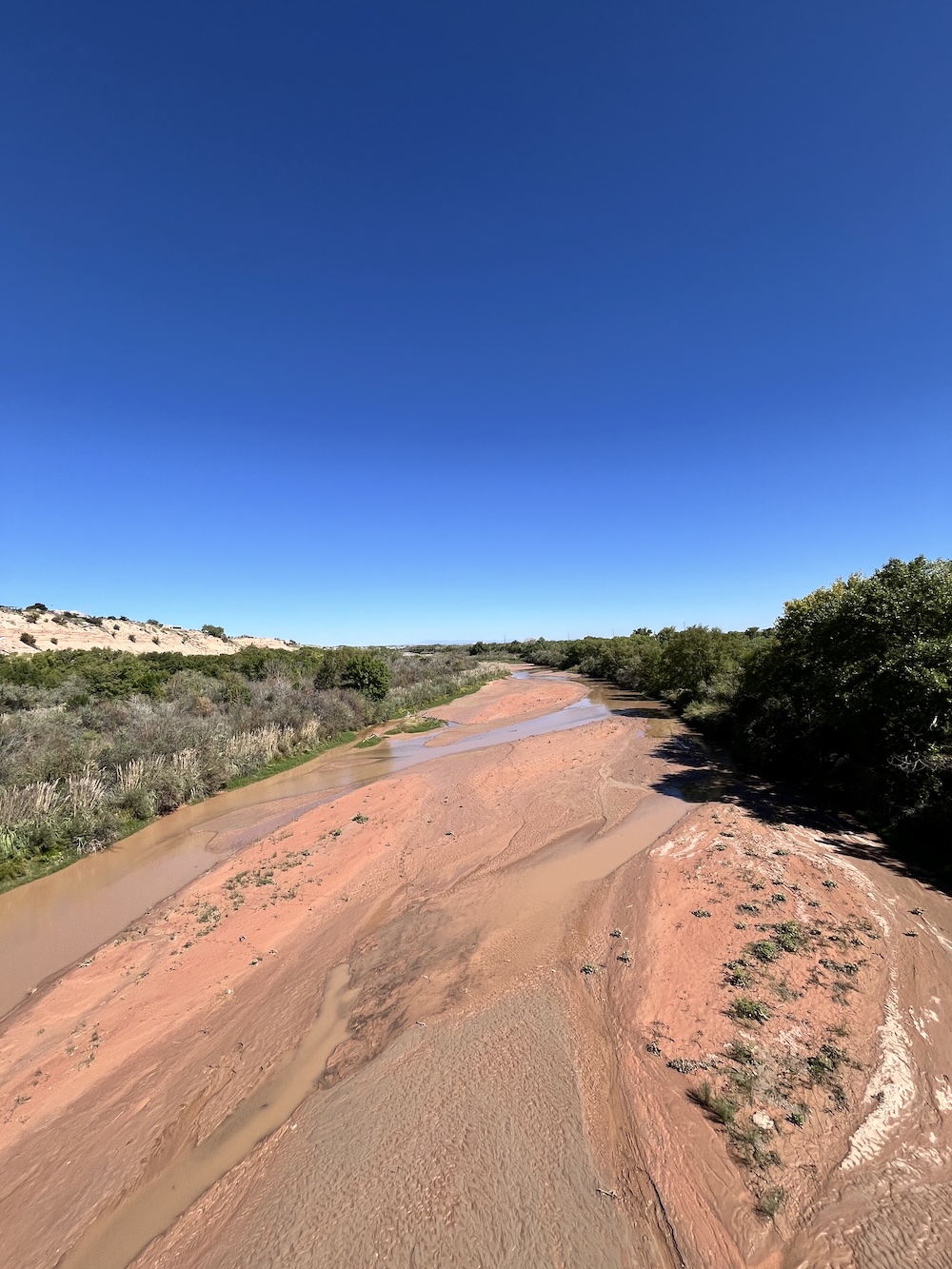 Then another whim: Check the state of the Rio Not-So-Grande. Up the Gail Ryba Memorial Bridge I rode. Yikes, etc. Back to the bosque trail.