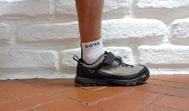 I chose the old DBR Axis TT because it has 26-inch wheels (easy to throw a leg over); fat tires (squish squish squish); and boingy bits (boy-boy-yoinnnnng), all of which help minimize the impact to the bum ankle, which is wearing one of these doodads. Swapped the Time ATACs for flat pedals too.