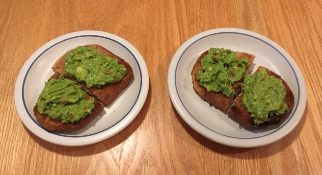 The other day I bought a six-pack of avocados to chop into a rough salsa for a batch of chipotle-honey chicken tacos. This proved to be about four too many, so there you have it. The bread is a robust whole-wheat number from the Toastmaster Bread Box recipe booklet.