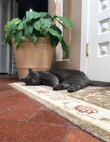 We’ve resisted the temptation to deploy the refrigerated air, instead strategically adjusting blinds, curtains, and fans, and so when Miss Mia Sopaipilla feels a nap coming on she seeks out the cool spot of that particular moment, flattening out like a Russian-blue rug.