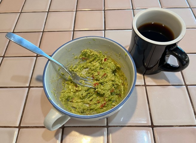 Half of the ingredients for guacamole toast, plus the obligatory mug of joe.