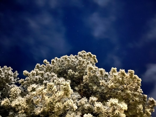 This is what a juniper dusted with snow looks like at 5:14 in the ayem.