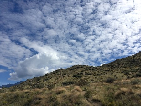 They’d seen a tarantula hairy-legging it across the trail and stopped for a peek, so I had one too. Didn’t take a pic, because I always feel like some sort of half-assed journalist — or worse, a tourist — when I’m doing that sort of thing where people can catch me at it. But it’s always educational to see one of the critters who actually belong here in the Upper Chihuahuan Desert.