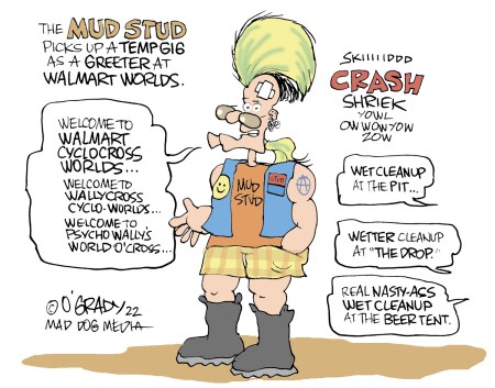 Like the rest of the cycling industry, the Mud Stud was at his absolute best during the Interbike trade show. Appearing in a long run of special-edition “Show Talk” strips, he bought 6,000 Missy Giove™ nipple rings, then unloaded them at a discount to Roseanne Barr; gambled the bike shop away to a Vegas mobster, then won it back with the backing of a trustafarian inline-skater geek name of Slater the Skater; and failed to make the show at all one year when he mistook New Mexico’s Las Vegas for the one in Nevada.
