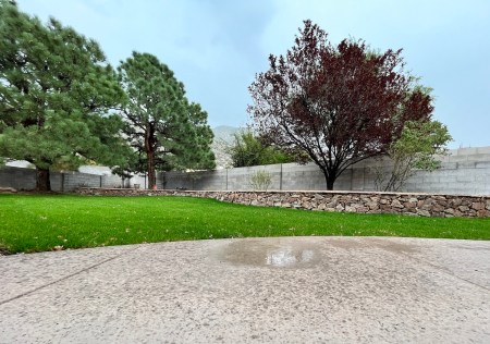 We were under a flash-flood warning and our cul-de-sac looked like a pond tipped on one side, draining into the arroyo behind the house, one of many that funnel water from the foothills to the Rio.