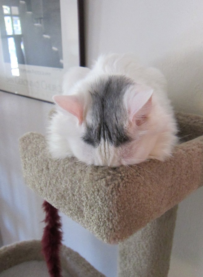 Happily, things begin to settle down and the whiskey bottle remains corked. It’s time for the post-breakfast nap. Mia snoozes in a donut atop the ’fridge, while Buddy beds down in his kennel. The Turk’ is last to fade. In his capacity as field marshal of the 1st Feline Home Defense Regiment he inspects the perimeter from various windowsills before finally settling down in the Tower of Power in the living room.